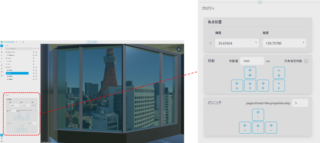 移動は前後左右上下、視点方向はパン・チルト(水平・垂直方向)で調整でき、検証したい視点を素早く作り込めます。